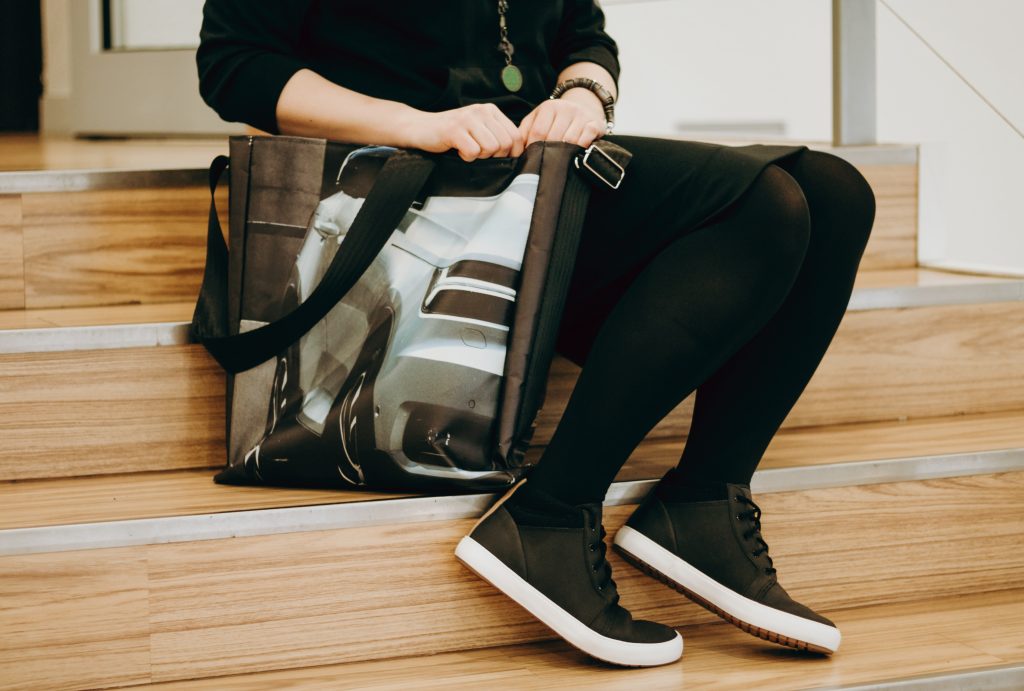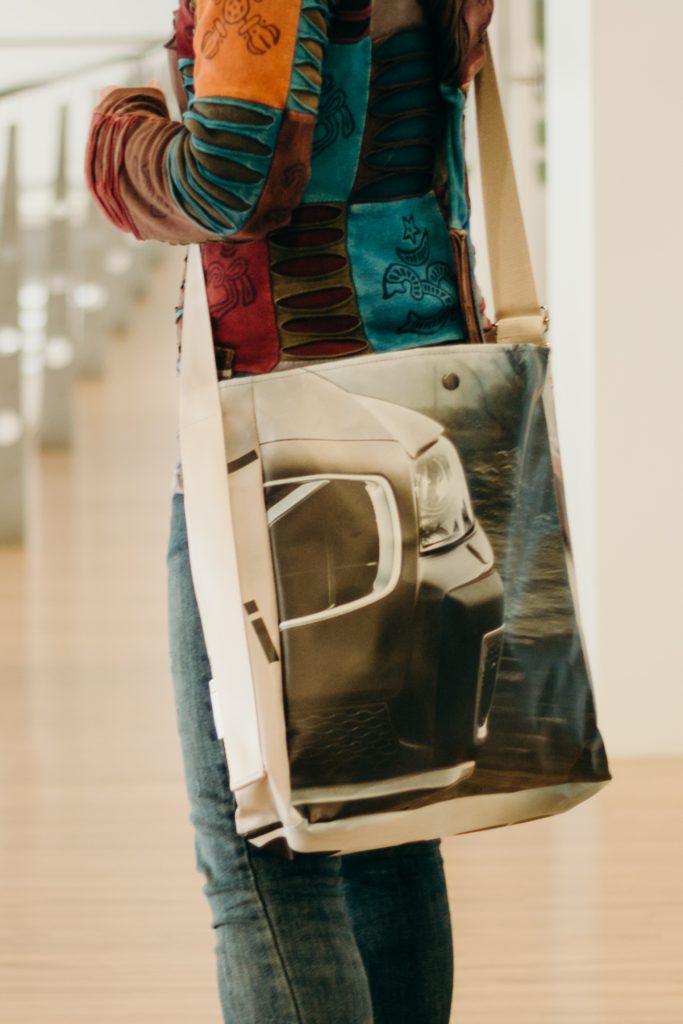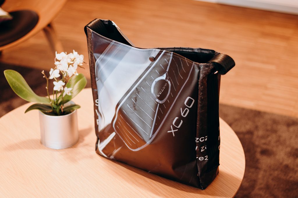 Każdego roku branża samochodowa generuje mnóstwo niepotrzebnych odpadów także na poziomie salonów sprzedaży. W końcu każdy salon musi wykorzystywać reklamę zewnętrzną, a więc kolorowe bannery drukowane na wytrzymałym, elastycznym materiale. Poznański dealer postanowił zebrać niepotrzebne materiały reklamowe i uszyć z nich modne torby. Ponieważ fragment banneru jest nieco inny, każda torba jest unikalna i ma inny wzór. Pasek torby wykonany jest ze starego pasa bezpieczeństwa.