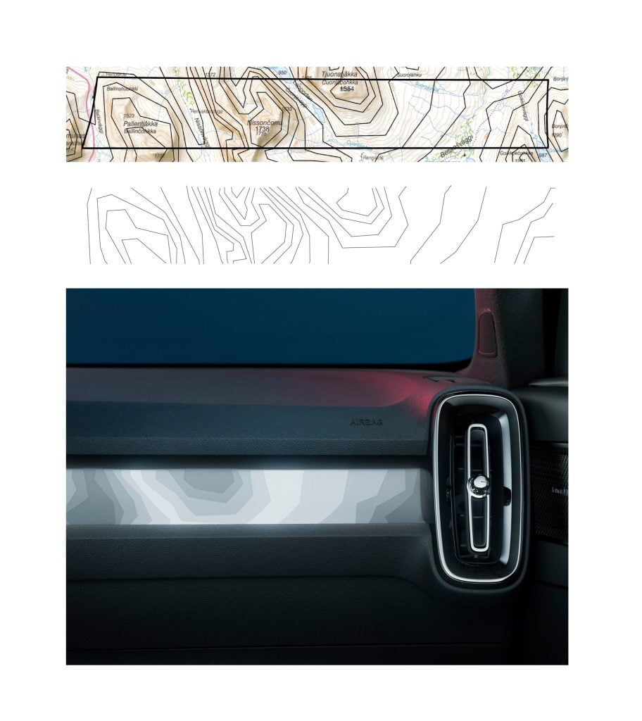Lakier nadwozia Fjord Blue, powstały z inspiracji malowniczymi ujściami rzek na zachodnim wybrzeżu Szwecji, zagląda do kabiny zgrabnie odnajdując swoją kontynuację w tkaninie tapicerki, która rozpościera się od podłogi do centralnej konsoli i przednich drzwi. Stanowi ona jednocześnie tło dla podświetlanych półprzezroczystych elementów deski rozdzielczej i paneli drzwiowych będących ukłonem w stronę majestatycznych górskich widoków parku narodowego Abisko.