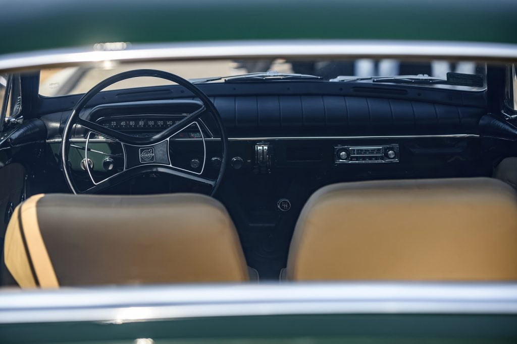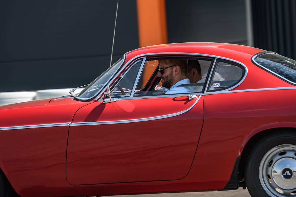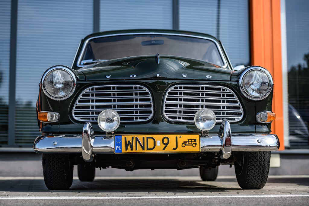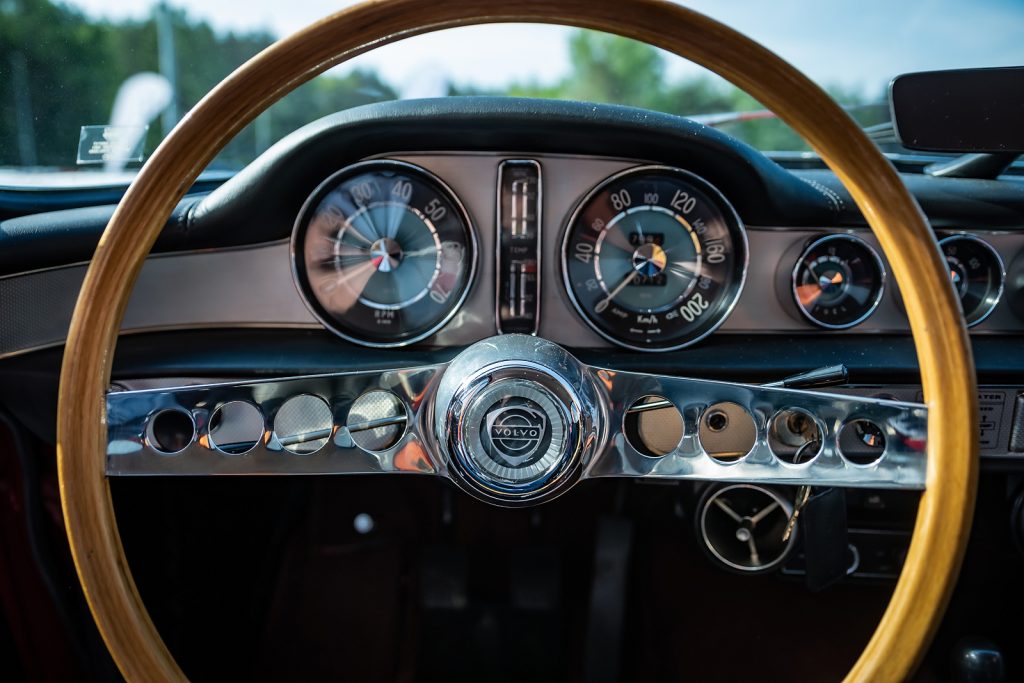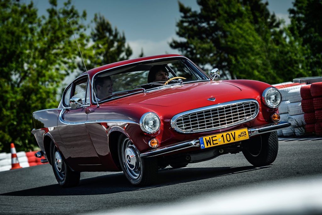 - Volvo P1800 S – 1966 rok, 1.8, 106 KM – ten samochód jako jeden z nielicznych nie przyjechał do Polski z Goeteborga. Należy do Volvo Car Poland, a wcześniej był odrestaurowany ponad 10 lat temu przez poprzedniego, polskiego właściciela. Zanim trafił nad Wisłę miał dwóch właścicieli w Stanach Zjednoczonych: w Kalifornii i w Arizonie. Wóz był zdecydowanie mniej elastyczny od Duetta, a to za sprawą zastosowania w nim dwóch gaźników. Mechanizm zmiany skrzyni biegów działa w nim precyzyjnie jak w zegarku. Wóz naturalnie nie ma wspomagania kierownicy, za to jej wieniec wielkości koła sterowego bardzo ułatwia wykonywanie wszelkich manewrów. Byle tylko ruszyć z miejsca. Tutaj lewarek skrzyni biegów jest dla odmiany bardzo krótki i można nim wybierać spośród aż czterech przełożeń do jazdy w przód. Za pomocą elektrycznej dźwigienki przy kierownicy włącza się elektryczny nadbieg. Sygnalizuje to czerwona kontrolka na desce rozdzielczej. W atmosferze skupienia i przy akompaniamencie huku dyfra ta dźwigienka pozwala osiągać prędkości trzycyfrowe. Także wyrażone w milach, jeśli ktoś będzie miał przez sobą wystarczająco długą prostą.