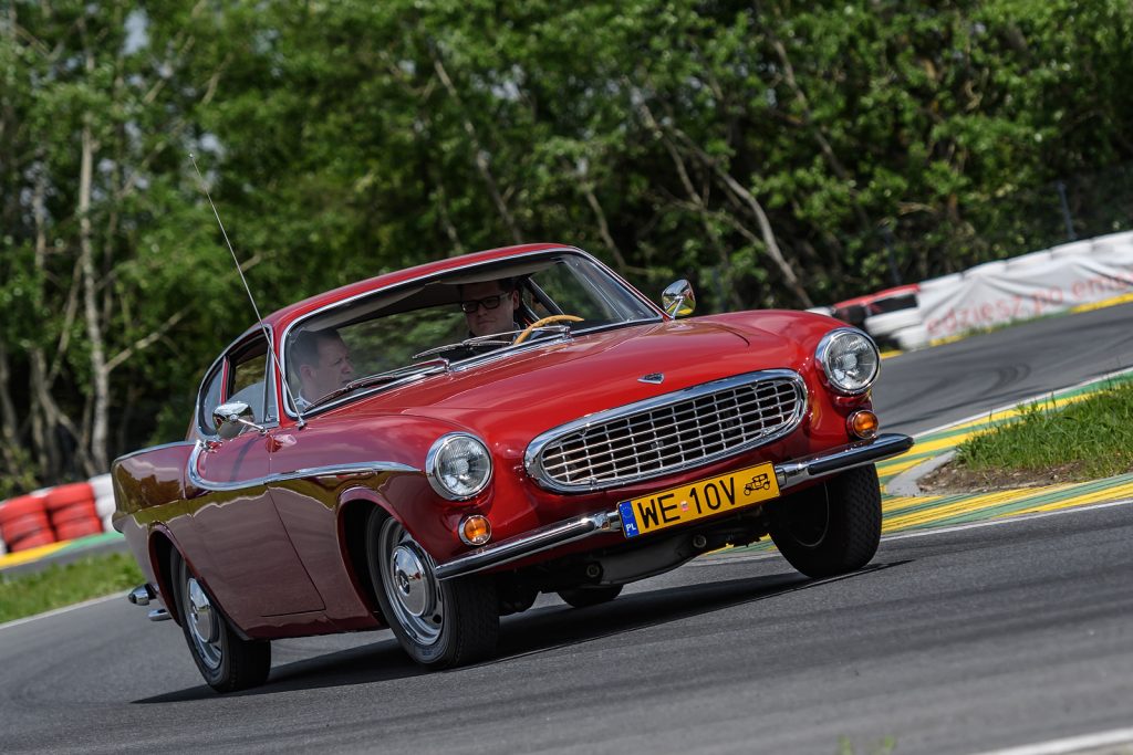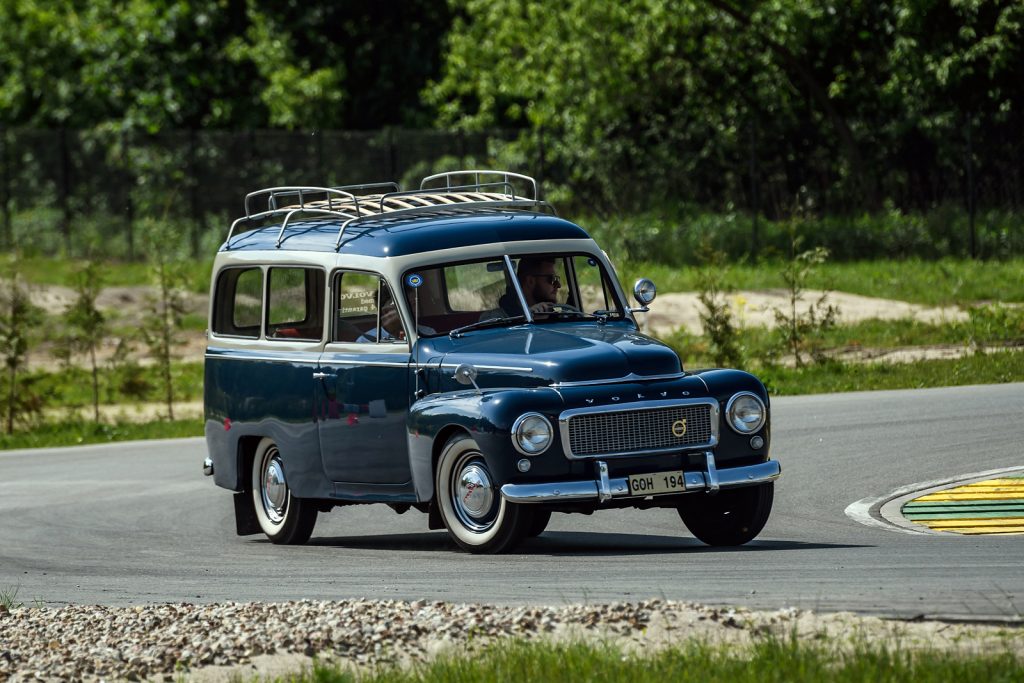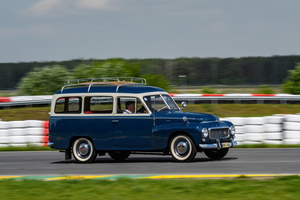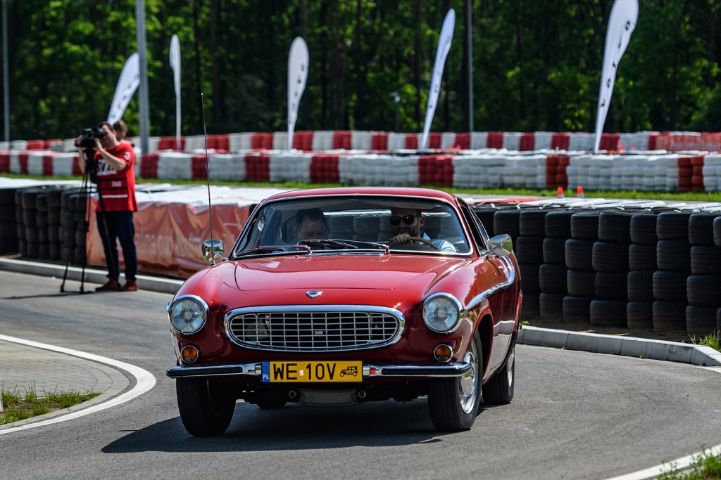 - Volvo PV 544 Duett – 1957 rok, 1.6, 60 KM – to pojemne kombi było jednocześnie najstarszym samochodem zabytkowym, którym można się było przejechać. Ten wóz powstał, by transportować z miejsca na miejsce towary i ludzi. Skutecznie i niespiesznie. Wszystkich jeżdżących zdumiewała elastyczność silnika, dzięki której operowanie trzystopniową skrzynią biegów nie było ani męczące, ani szczególnie potrzebne. Pierwszy bieg służy w tym aucie wyłącznie do ruszenia. Dwójka obsługuje zakres prędkości od 15 do ponad 70 km/h. W praktyce na torze nie było potrzeby sięgania po lewarek skrzyni biegów, który liczył ponad 40 cm długości. Zegary przypominały te zastosowane w późnej serii Warszawy. Różniły się jakością wykonania i zakładem produkcji. Dostarczył je niemiecki VDO. Rura wydechowa auta ma średnicę niewiele większą od słomki do napojów. Na desce rozdzielczej widnieje tabliczka z datą odrestaurowania auta – 2001. Przestrzeń w kabinie zdumiewa: jest jej bardzo, ale to bardzo dużo.