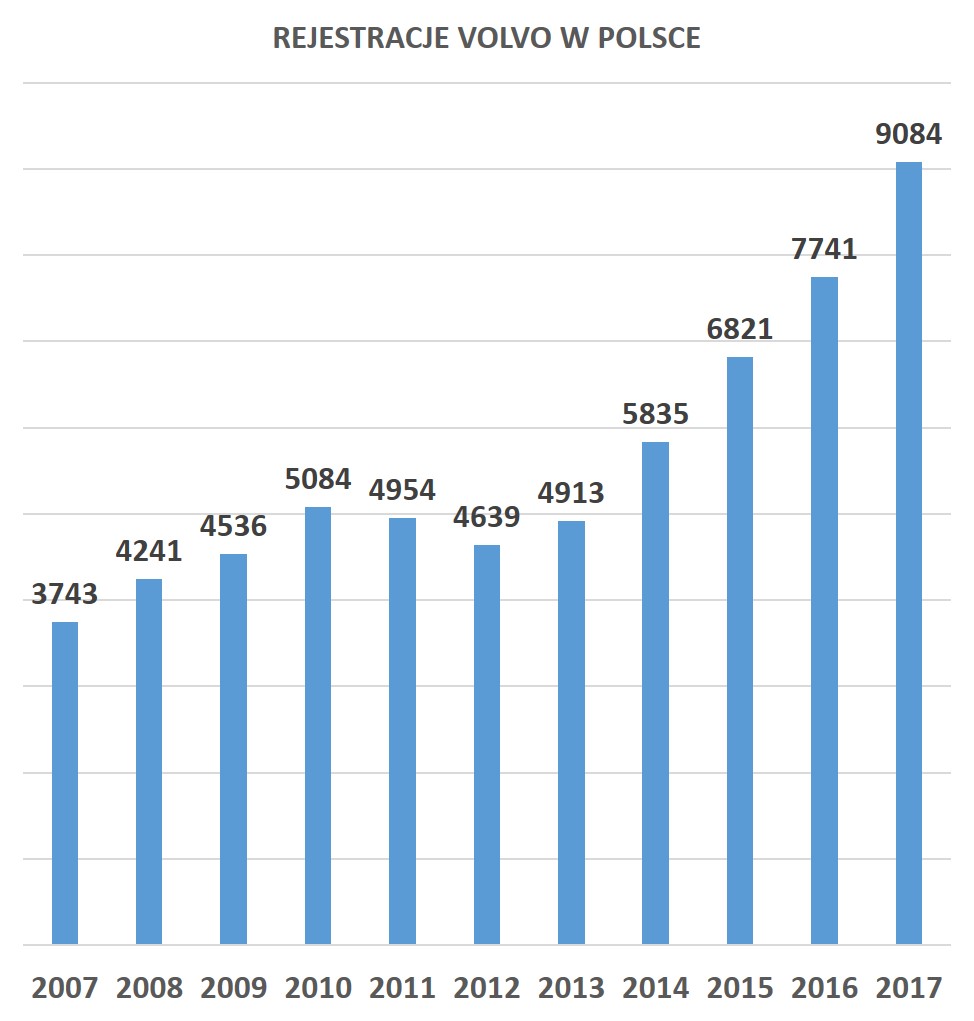 Volvo Car Poland odnotowuje ciągły wzrost sprzedaży od 2012 roku. W ubiegłym roku dostarczono polskim klientom 9084 pojazdy. Dla porównania jeszcze w 2007 roku sprzedaż Volvo w Polsce była na poziomie 3743. sztuk. Wzrost sprzedaży Volvo Cars na całym świecie wyniósł w ubiegłym roku 7%, a globalna sprzedaż osiągnęła poziom 571 577 aut. Dynamika wzrostu naszego rynku była jeszcze wyższa i wyniosła ponad 17%. (2017 vs. 2016)